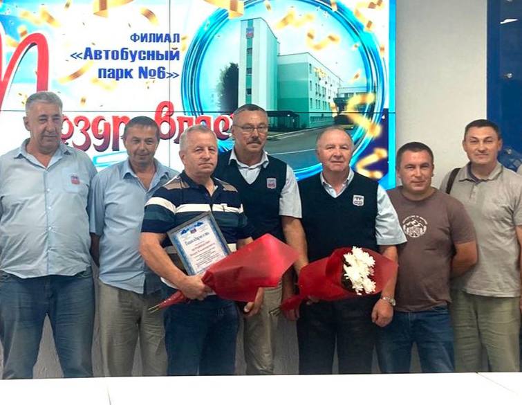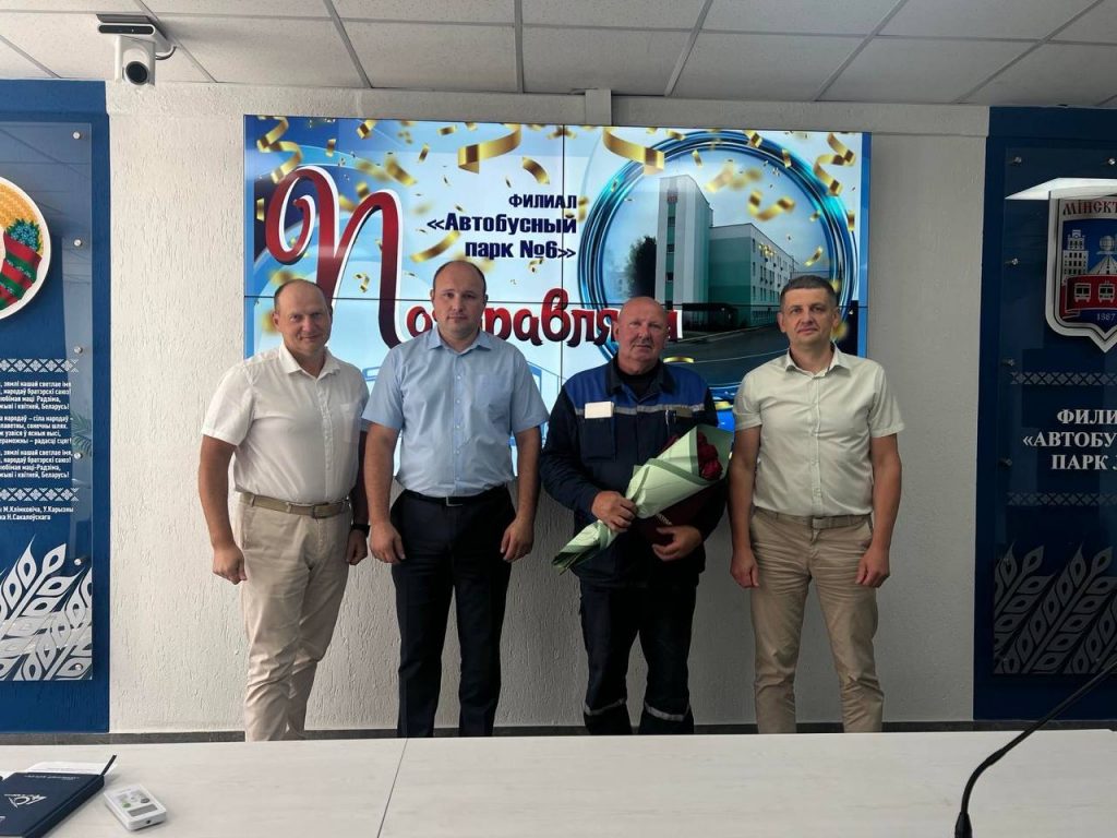 В филиале «Автобусный парк №6» с 40-летним стажем работы на предприятии поздравили оператора диспетчерской станции Тарасик Татьяну Александровну, водителя отдела организации перевозок Зеленевского Владимира Константиновича и механика ОТК Барташевича Николая Ивановича.