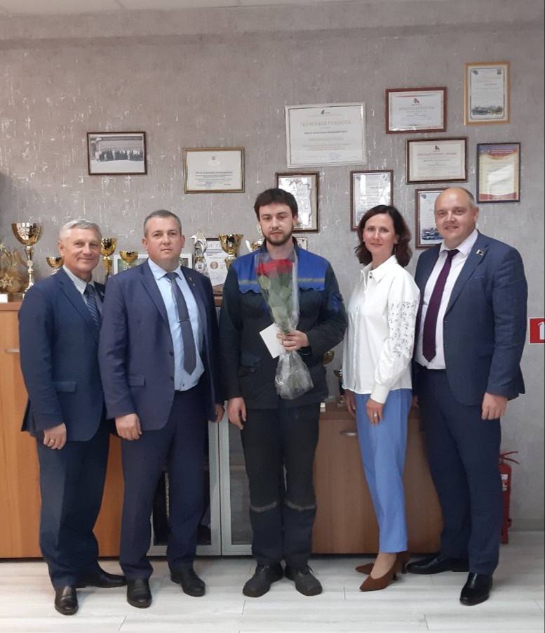 В филиале «Автобусный парк №7» с присвоением почетного звания «Ветеран труда» поздравили водителя автомобиля Мащицкого Сергея Владимировича. С 30-летним стажем работы на предприятии поздравили водителя автомобиля Лапцевича Александра Васильевича.