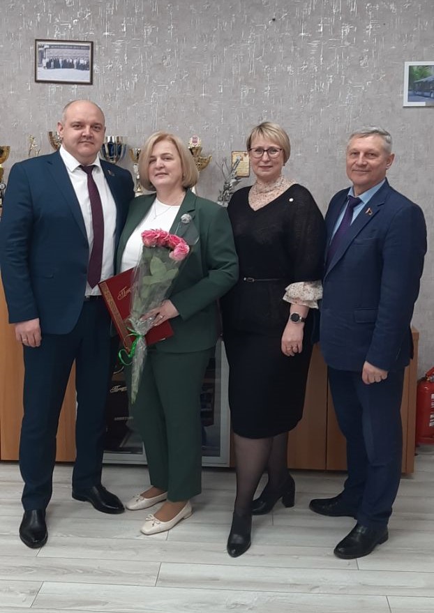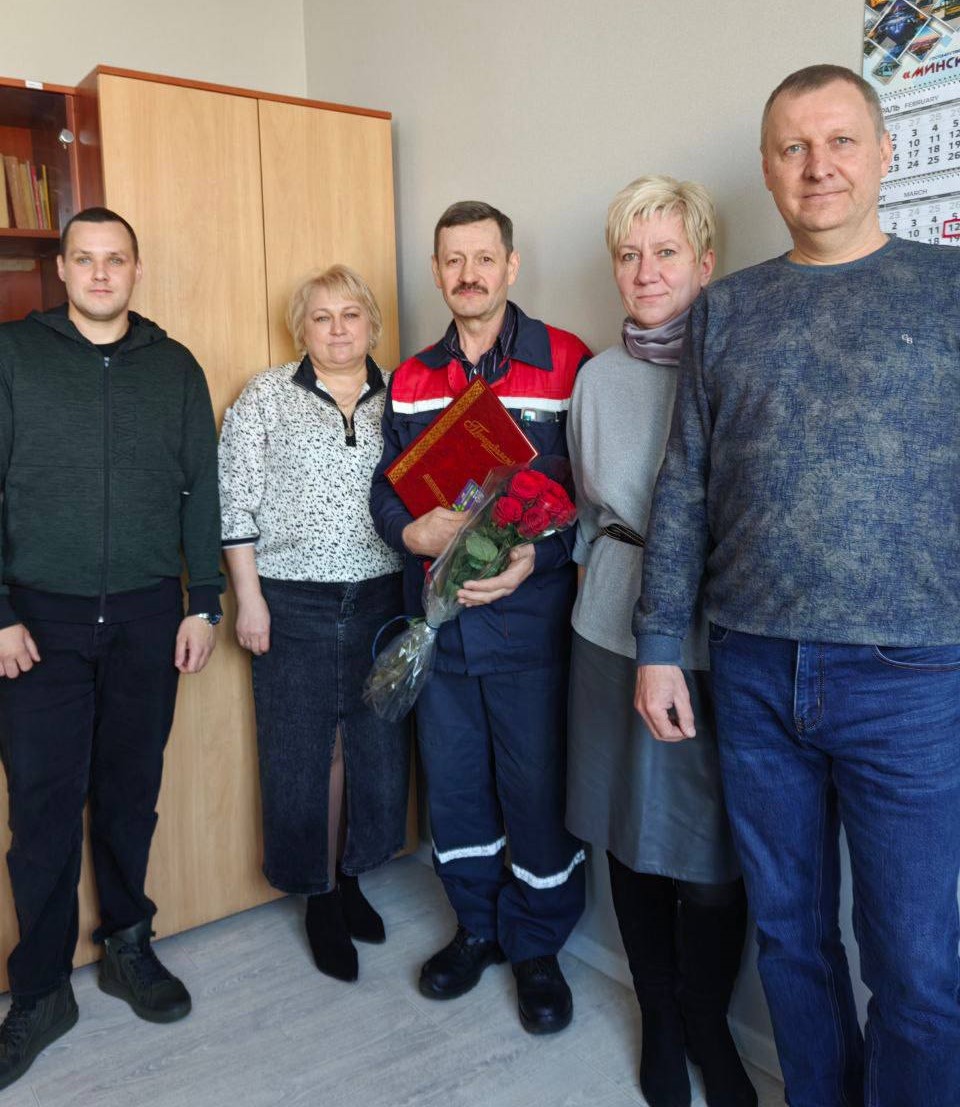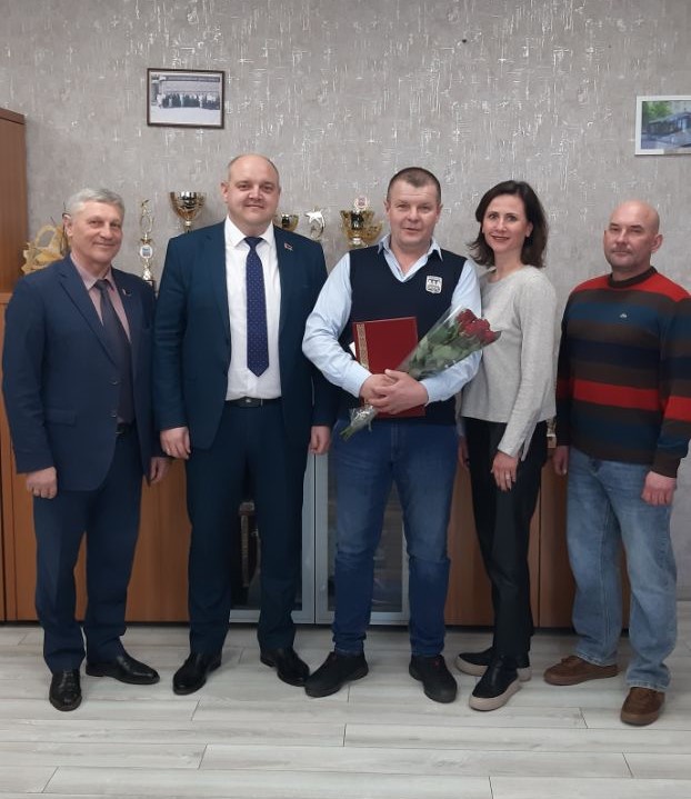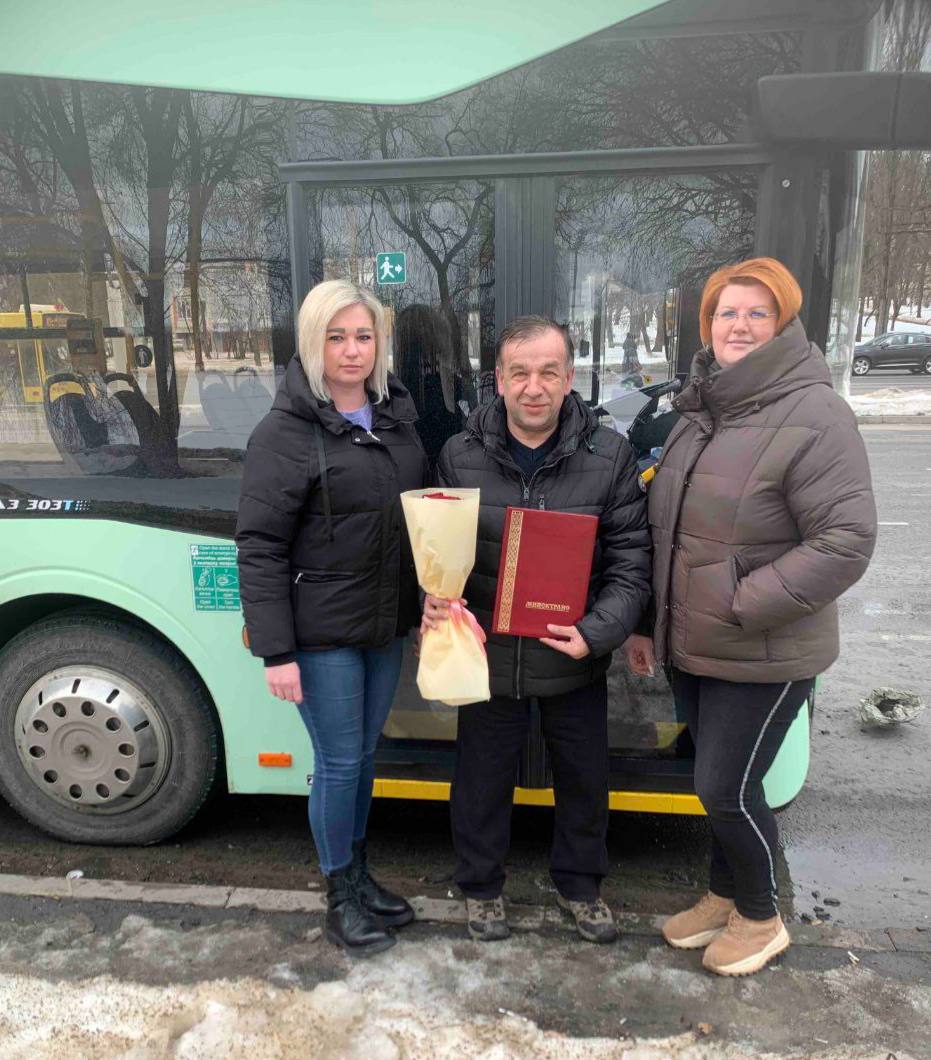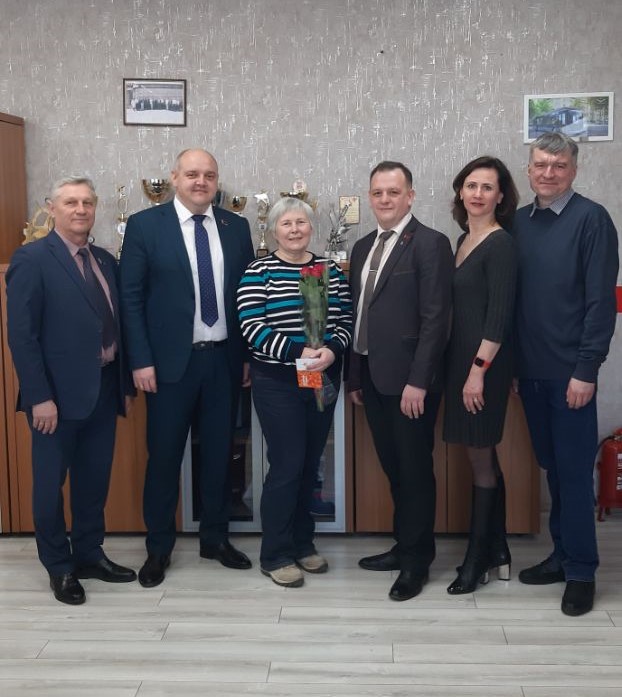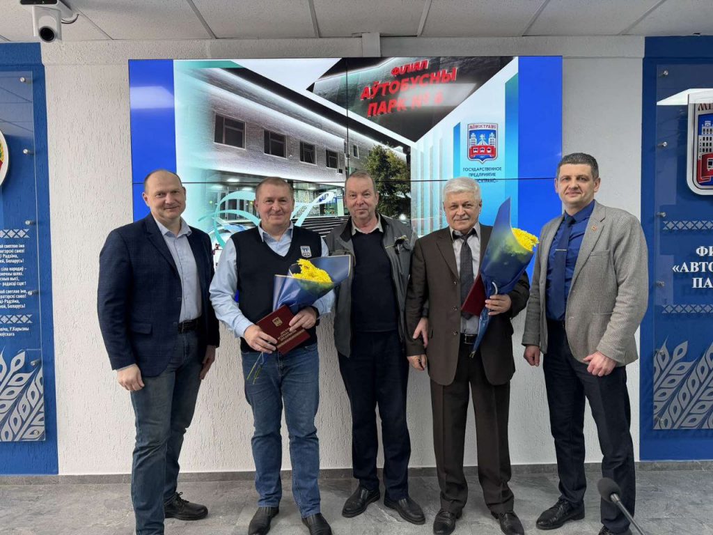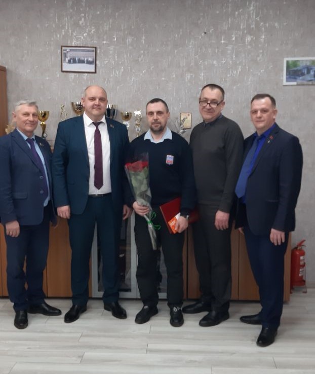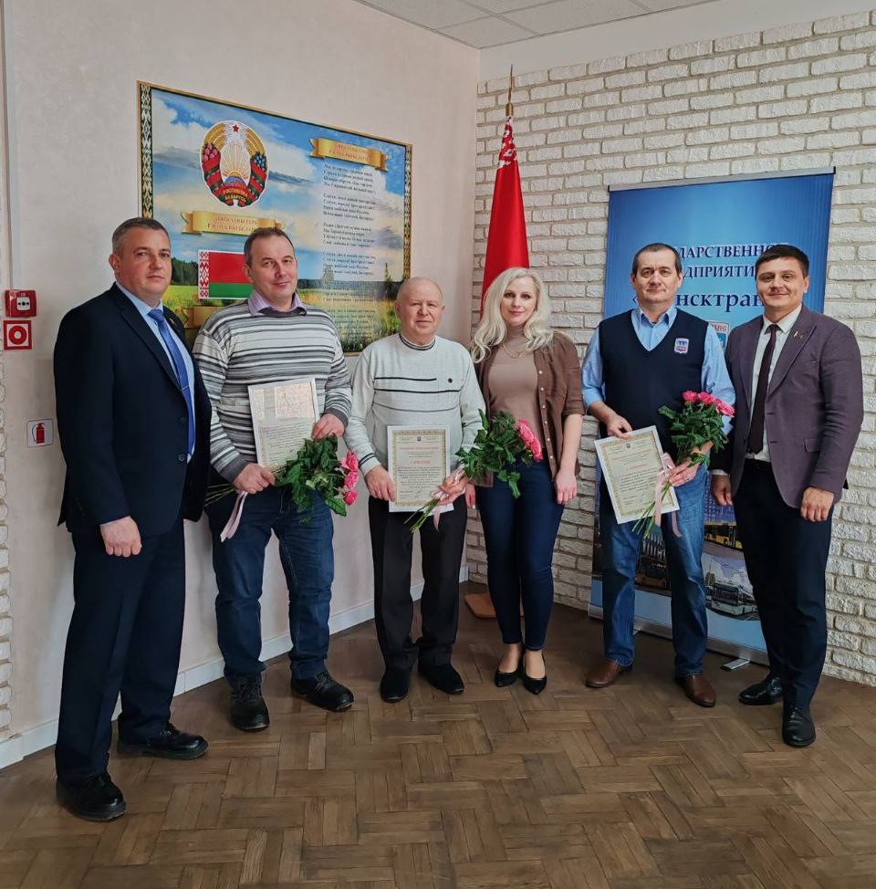 В филиале «Троллейбусный парк №5» с юбилеем поздравили водителей Реута Виктора Марьяновича и Глинского Сергея Александровича, контролера электромонтажных работ Тышкевича Вячеслава Иосифовича. С 40-летним стажем работы на предприятии поздравили Цубикова Сергея Ивановича.