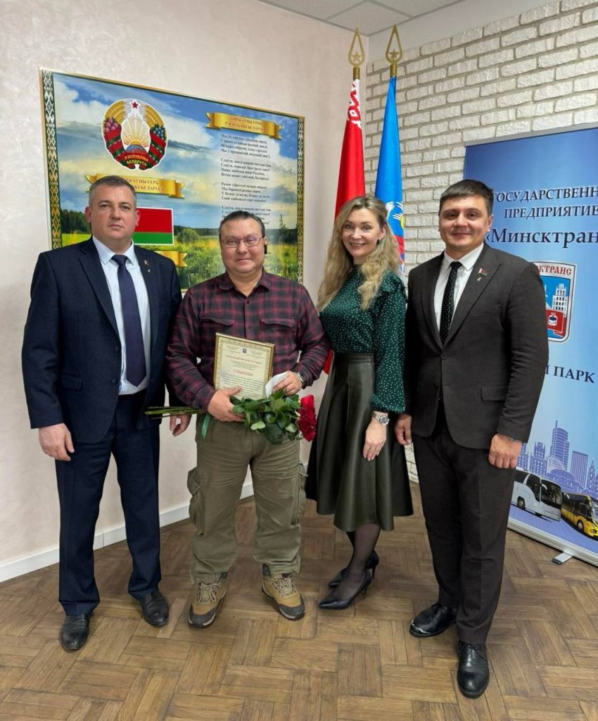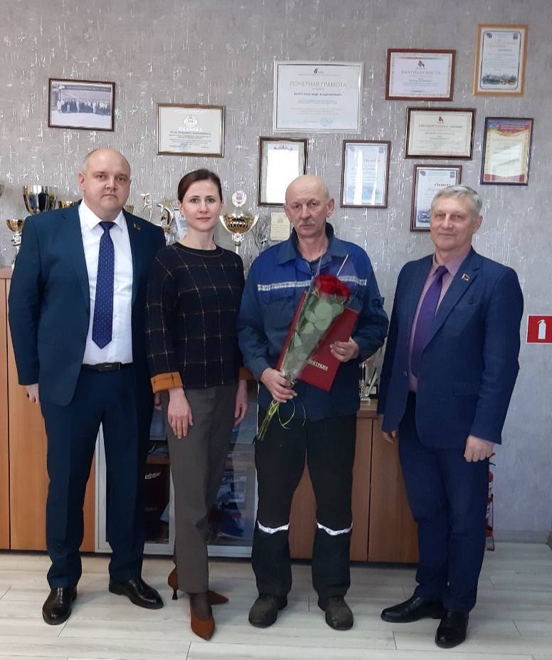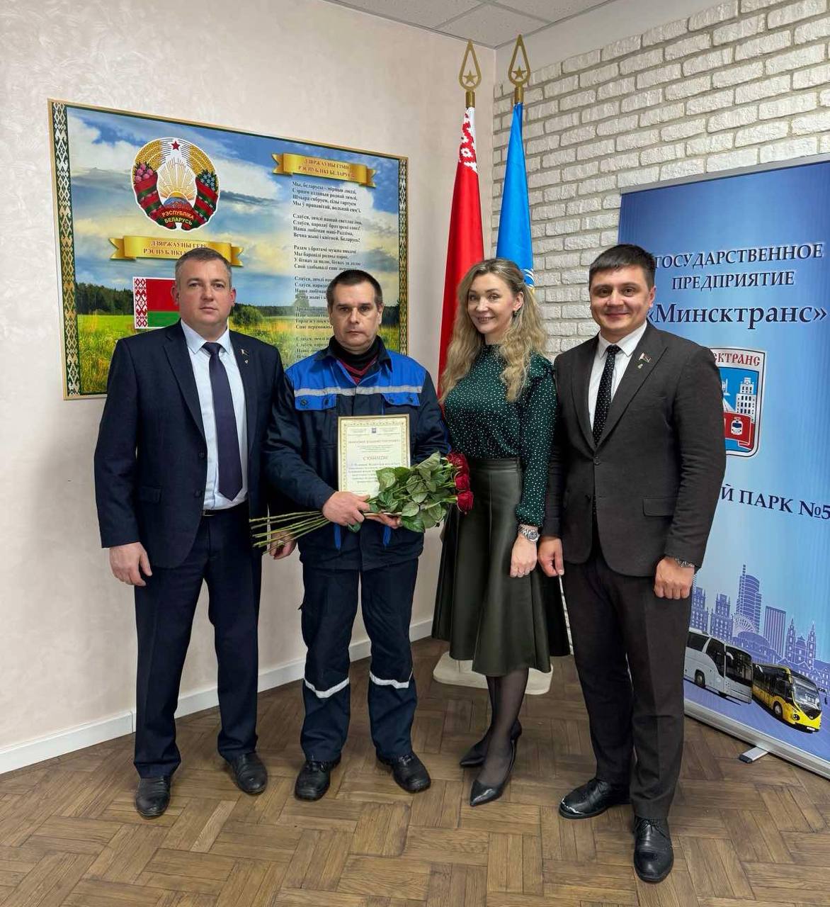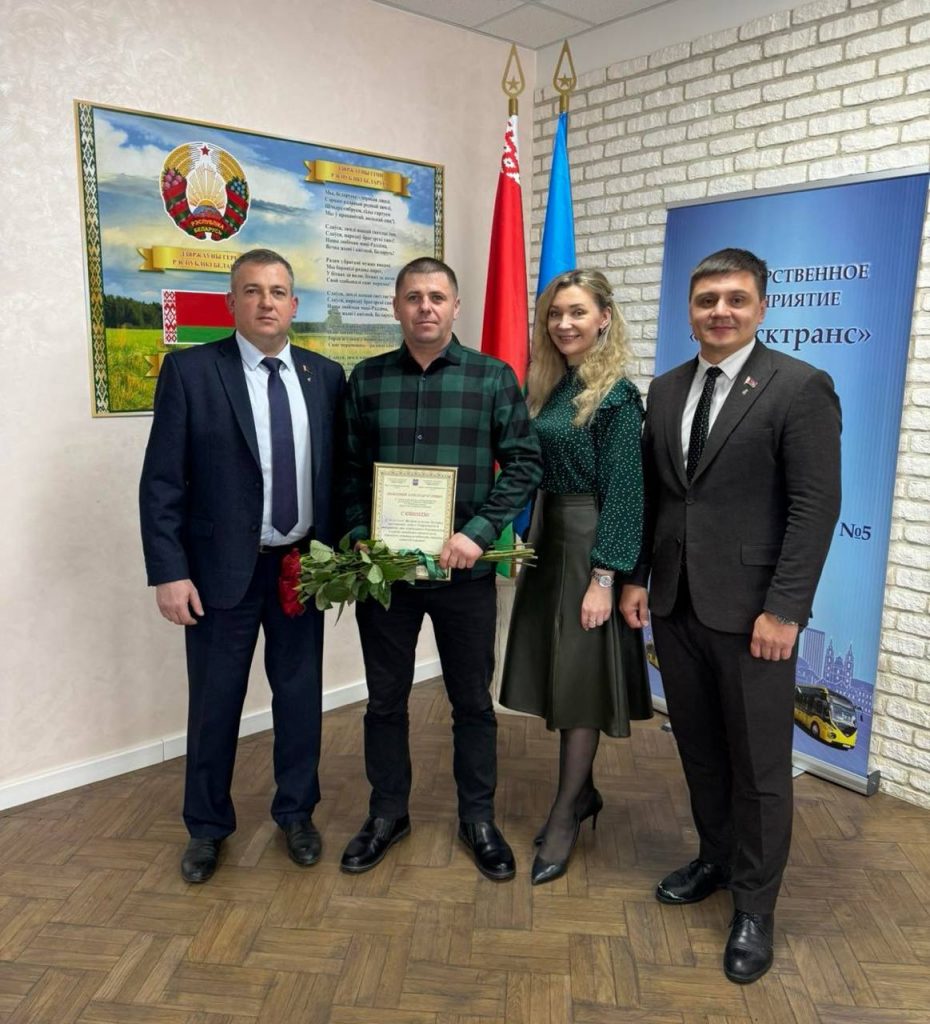 В филиале «Троллейбусный парк №5» с 40-летним трудовым стажем поздравили водителя Кулеша Николая Адамовича и слесаря Скакуна Михаила Владимировича. С юбилеем поздравили слесаря Гарбацевича Часлава Ивановича, водителей Ждановича Виктора Иосифовича и Гайдука Евгения Михайловича. Также на заслуженный пенсионный отдых торжественно проводили водителя Бруек Валентину Ивановну.