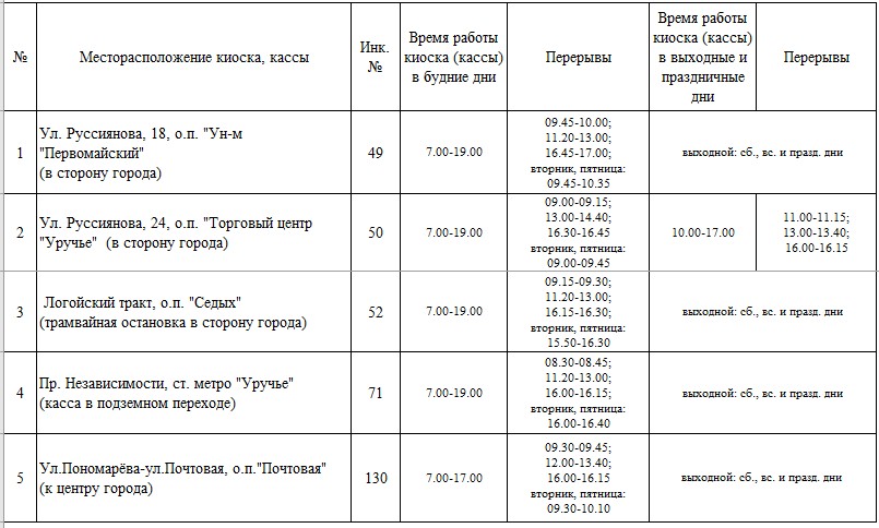 киоски, кассы, автовокзал, автостанции, диспетчерские пункты (станции) государственного предприятия «Минсктранс», кассы государственного предприятия «Минский метрополитен», киоски «Табакерка» СЗАО «Энерго-ойл» – продажа билетов на одну поездку на городские перевозки пассажиров в регулярном сообщении, проездных документов на городские перевозки пассажиров в регулярном сообщении на бесконтактных смарт-картах государственного предприятия «Минсктранс» (электронных билетов)