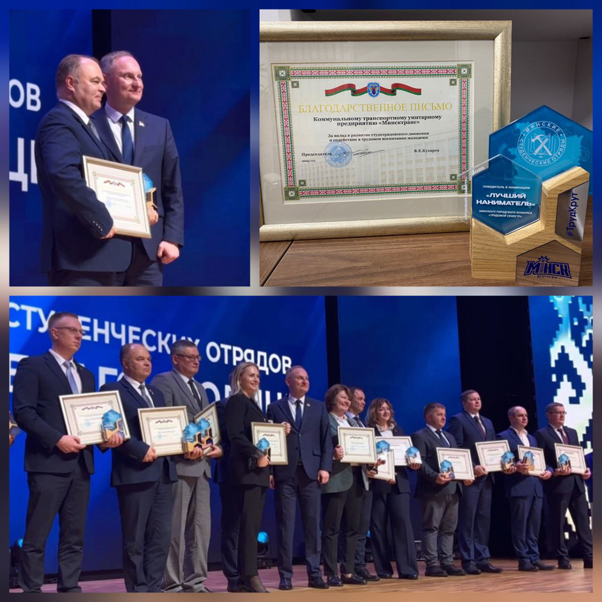 За вклад в развитие студотрядовского движения и содействие в трудовом воспитании молодежи государственному предприятию «Минсктранс» в лице генерального директора Олега Дзюбенко заместитель председателя Мингорисполкома Андрей Стригельский вручил Благодарственное письмо. Также нашему предприятию из рук первого секретаря Минского городского комитета БРСМ Алексея Пикуса была передана Благодарность в номинации «Лучший наниматель».